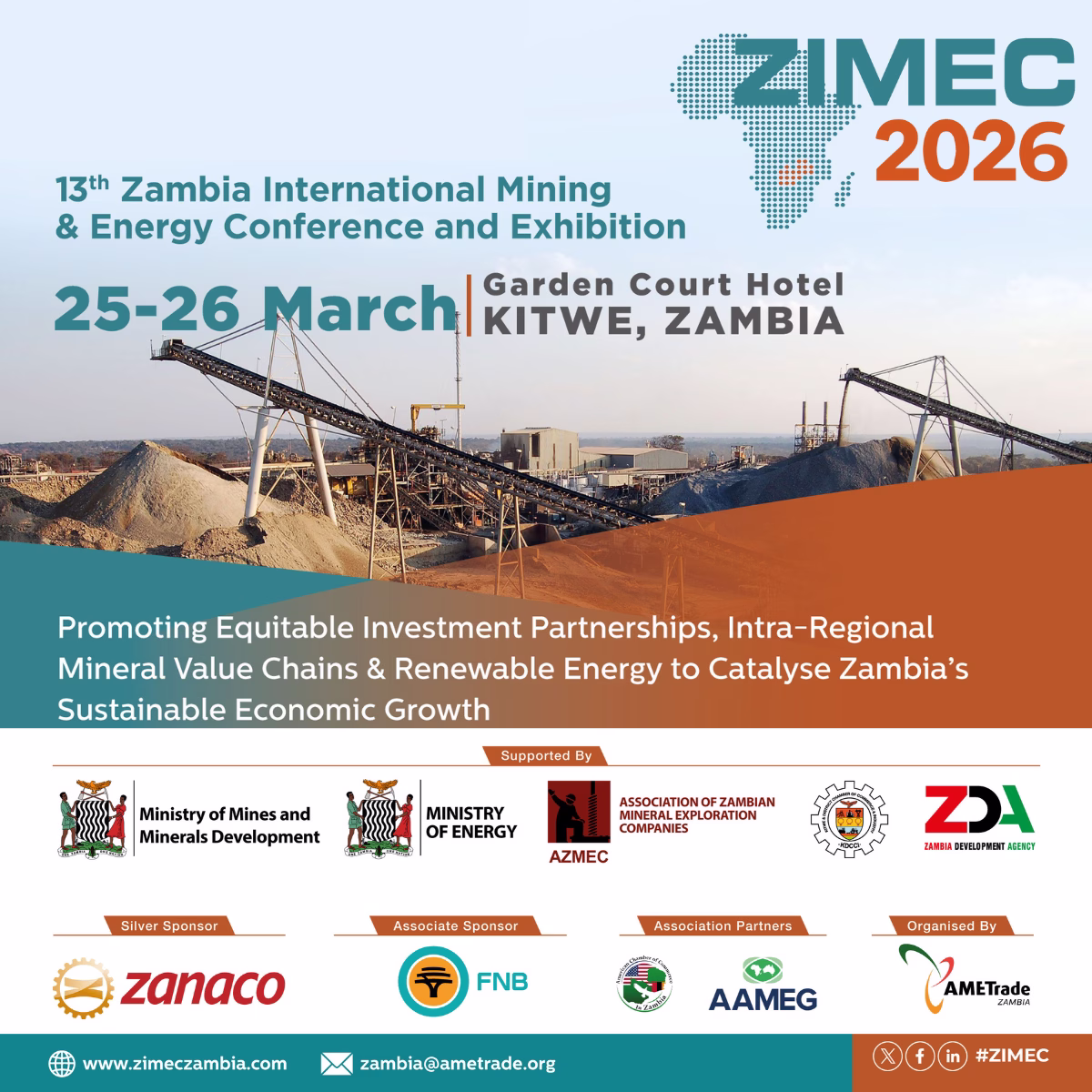 As Zambia advances ambitious targets across mining production, energy reform, and regional trade integration, the 13th edition of the Zambia International Mining and Energy Conference and Exhibition (ZIMEC 2026) will convene policymakers, industry leaders, financiers, and technical experts to examine how the country can translate momentum into long-term, sustainable growth. ZIMEC 2026 will take place at the Garden Court Hotel, in Kitwe at the heart of the Copperbelt from 25 – 26 March 2026.